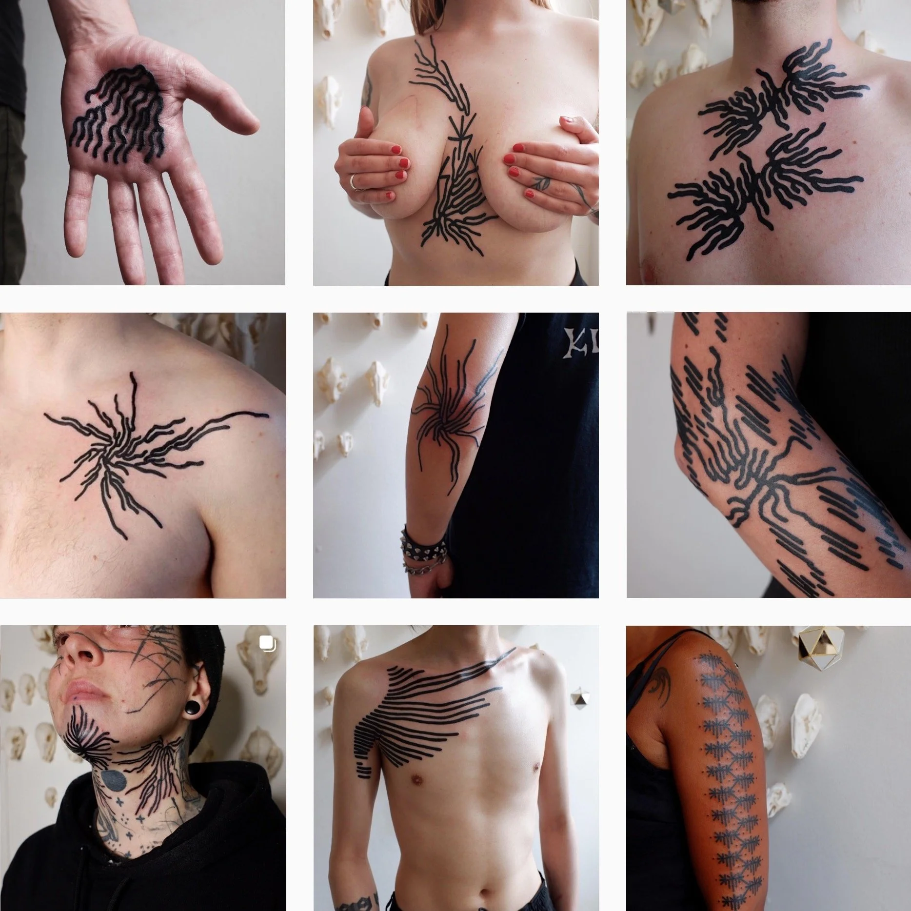 Bolder line trends coincide with the spread of modern sigil tattoos. While @stanotma does offer stenciled geometric designs, his freehand work stands out. Reminiscent of lightning, cracked glass or flowing water, these pieces have an organic quality with a wandering mood.